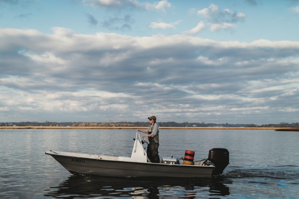 This is the office of Äna Shellem, owner and operator of Shell’em Seafood, commercial fisherwoman and badass queen of the salt marsh. She sells seashells not just by the seashore, but to top restaurants across the Coastal Plain and Piedmont of North Carolina — including Brodeto and St. Roch Fine Oysters + Bar in Raleigh, Basnight’s Lone Cedar Café in Nags Head, The Hackney in Little Washington, and Olivero and Seabird in Wilmington.