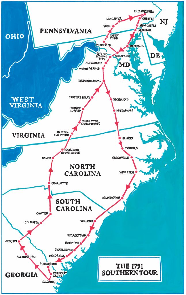 Washington was a planner, and he immersed himself in the journey’s details. He consulted with his secretaries and gentlemen travelers to understand the roads and inns of the South. The president decided to go south along the fall line and the Coastal Plain and to make the return north through the Piedmont, the higher land between the Lowcountry and the mountains. He charted a route that gave him a good feel for the region, though he specifically wanted to visit Charleston, South Carolina, then the fourth-largest city in the country and a place of influence and affluence. Georgia’s two notable places were Savannah and Augusta, so he was going no farther south than those towns. Atlanta didn’t yet exist.